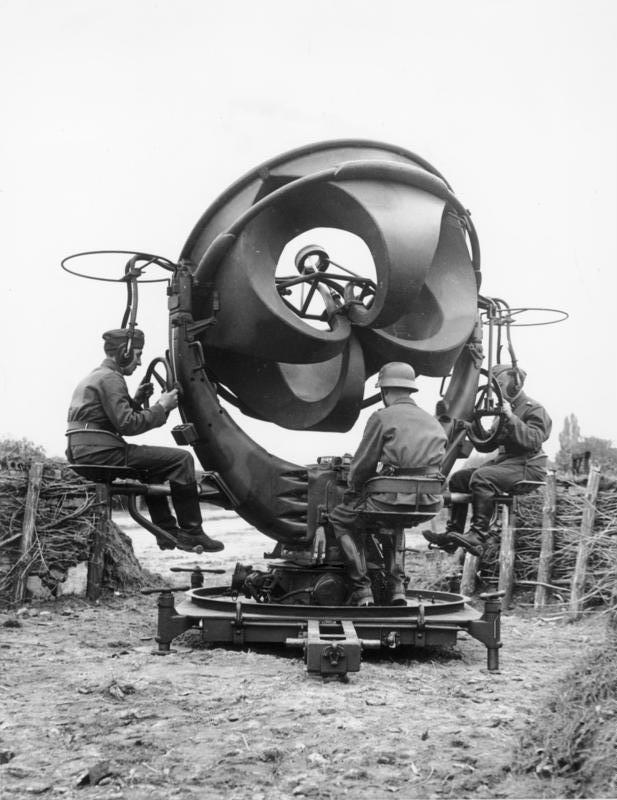 One of the experimental 'personal sound locators' tested by the Dutch military research station at Waalsdorp, before the personal parabolas above were adopted as the best solution.