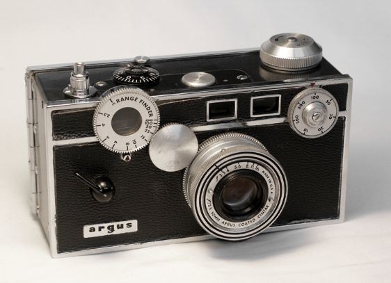 This also looks like it is the product of Photoshop delurium, but again it is real. This is the Kodak 35 RF camera hastily introduced in 1940 to meet competition from the Argus C series rangefinder cameras. The clumsy lump on the side of the lens contains a cam and levers for coupling the focus ring to a rangefinder in the top of the camera.