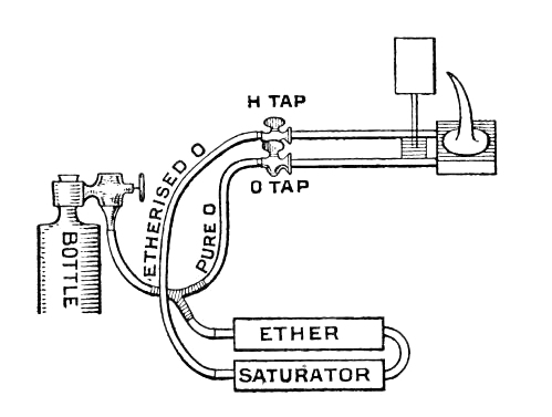 "To Light Up with Ethoxo. See that H jet tap is open and 0 jet tap closed.Turn cylinder key, then give regulator a few turns.When you smell ether, take off chimney of lantern,and after waiting a few seconds apply a light. Don't be alarmed at a big flame. Turn it down by the regulator till there is an inverted cone of burning vapour of about two and a half inches in length. Warm lime as usual, then gradually turn on 0 tap at the jet, and adjust just as you would with a blow-through or a mixed jet." |