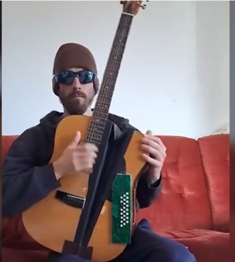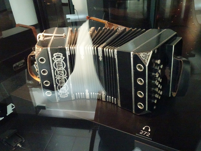 This is not a concertina as such; it is a development of it called the Bandoneon. It is much associated with the Tango dance. The Bandoneon is usually Bisonoric, (a word I have never encountered before) which means you get different notes when you push or pull the bellows; this makes it hard to learn. Some Badoneons are monosonoric, as is the piano-accordian. Many tango players play almost entirely while pulling the bellows; on pushing them shut an air release button allows rapid closing.