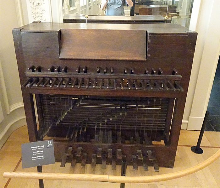 A Carillon is a set of bells on which you can play tunes, either by pushing levers or operating pedals. Usually they consist of large bells hung in a high tower, so the music rings out over the town. This raises the question of how to practise before being loosed on the public, and the Practise Carillon (also called the Study Carillon) is the answer. Usually metal tone bars or metal tubes are used to make the sound rather than conventional bells. The museum label says only that it is Belgian and was built before 1892.