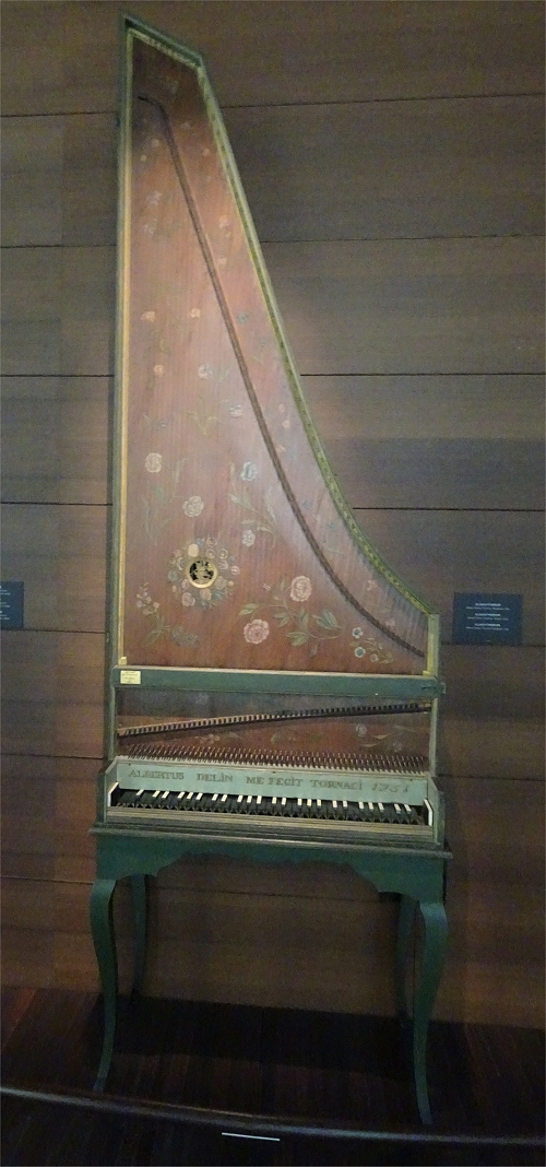 The label attributes this instrument to Albert Delin of Tournai, Belgium, in 1751; he apparently did come up with a satisfactory action.