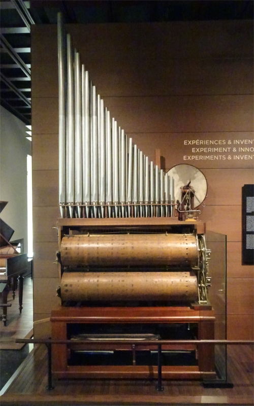 The MIM label says: "Jeu de trompettes (Domestic Barrel-Organ) by Davrainville Fils, Paris 1823".