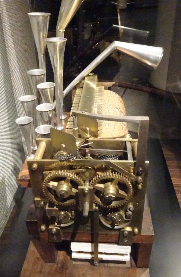 When one barrel is playing the other is silent but moves sideways to select the next bit of music, controlled by a pseudo-random mechanism something like a roulette wheel. Thus a piece of music is made up of randomly selected measures played as an 80 measure piece, with eight variations for every two measures. Quite remarkable.