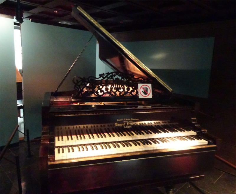 The museum label says: "Double Grand Piano with mirrored keyboards: Mangeot Freres et Cie, Paris, 1879"