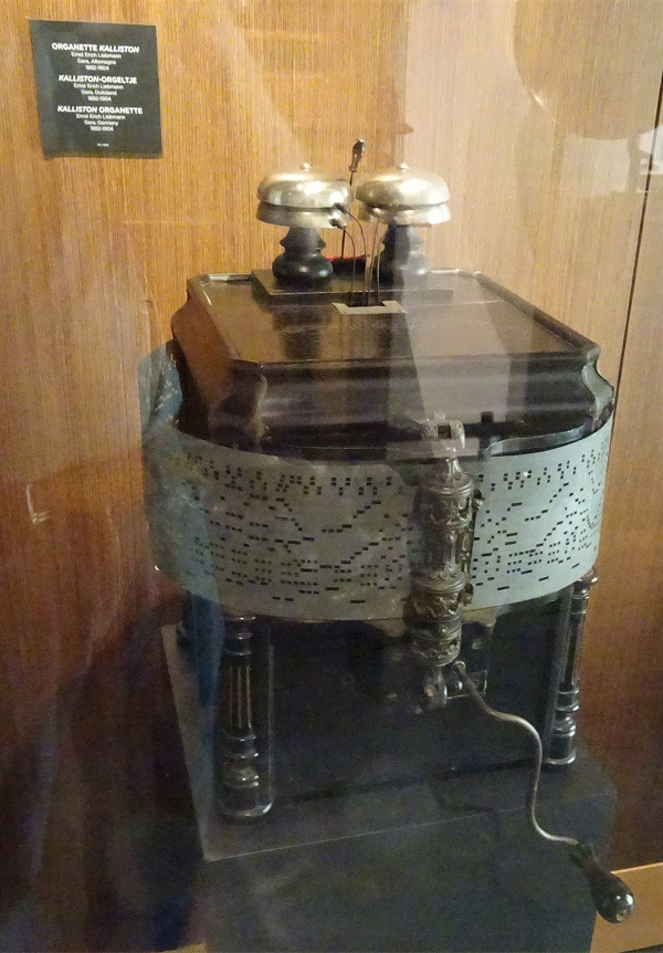 This box wrapped in a pianola reel is a Kalliston Organette. It was operated manually by turning the handle at bottom right. Several versions were produced, all with 24 notes and either 24 or 48 free reeds, plus a variable number of bells. (usally four) Options included a drum, and some sort of tremolo device. All models had "Forte & Piano Contrivances", presumably a swell flap which opened and closed to to control loudness.