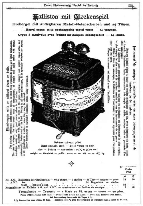 A contemporary advertisment for the Kalliston Organette. The vertical english text on the left says it may be bought with or without drum or bells.