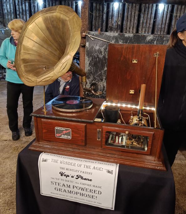 This magnificent steam-powered gramophone was bulit by Mr James Huntley. He calls it the Vap-O-Phone.