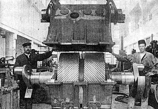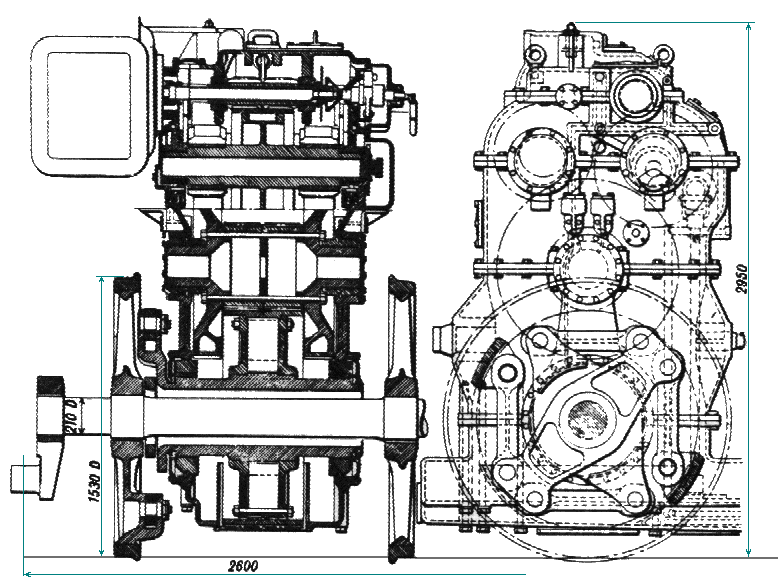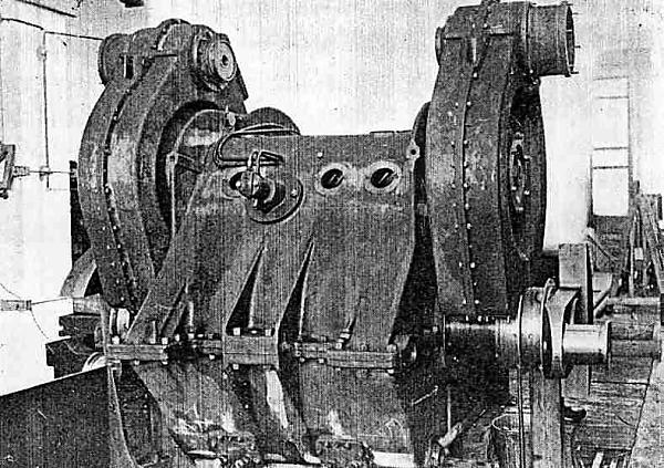 Note the massive proportions of the helical gearwheels and the crankshaft. The gearteeth are slanted in opposite directions to cancel end-thrust.