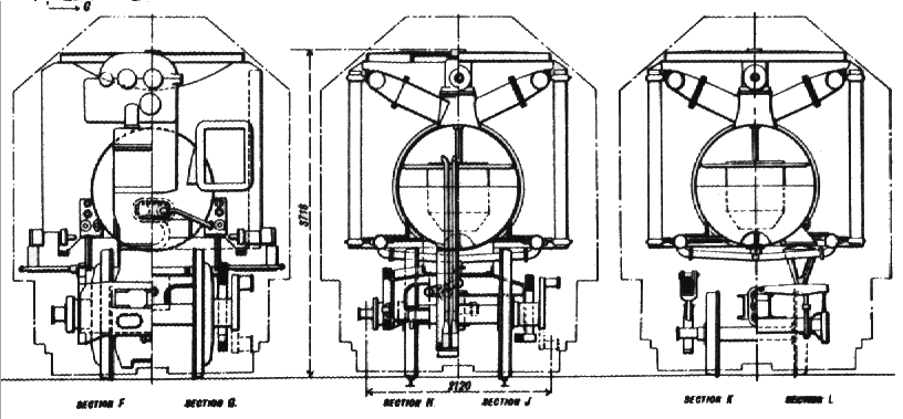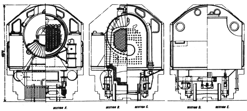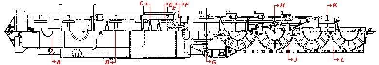 Above: Top view of Turbine Locomotive, showing where the sections below are taken.