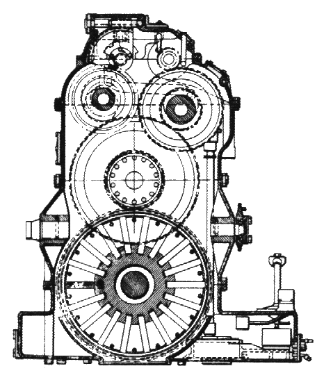 For reversing an idler gear between the 2nd and 3rd reduction stages was used, which could be brought into operation by means of a worm gear and a linkage using eccentric shafting. The operation was made purely mechanically by a screw shaft in the cab, like the reversing control of a piston locomotive.