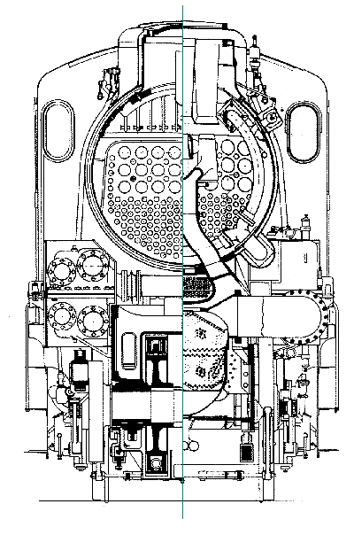 Most of the information in this paragraph is deduced from the engineering drawings below, so accuracy-wise you'd better keep your fingers crossed. The condenser was mounted under the front of the boiler, and its circulating water was cooled by the cooling unit at the very front of the locomotive. The boiler was conventional, with the usual super-heater tubes, and draught was induced by a triple blastpipe. A draught fan, as used in many other turbine locomotives, was explicitly ruled out as these always gave trouble when they were eroded by ashes and cinders in the exhaust gases. This raises the question of the purpose of the condenser, as if it was intended to conserve water, blowing steam up the chimney would not be helpful. (Probably there was a valve that shut off the chimney blast when it was not needed, but so far this is not clear from the engineering drawings below) It is therefore likely that the condenser was instead intended to provide a vacuum for the turbine exhaust, to increase efficiency.