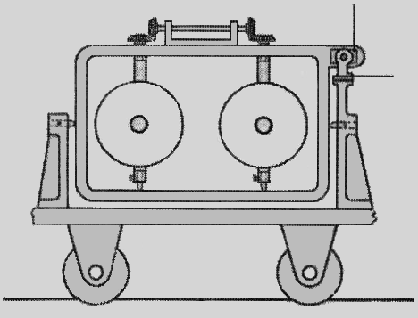 The vehicle was balanced by two vertical gyroscopes mounted side by side, and spinning in opposite directions at 3000 rpm. Each gyroscope was 3.5 feet in diameter and weighed 3/4 of a ton each. They were enclosed in evacuated casings to reduce air-friction losses. The rotational axes were horizontal.