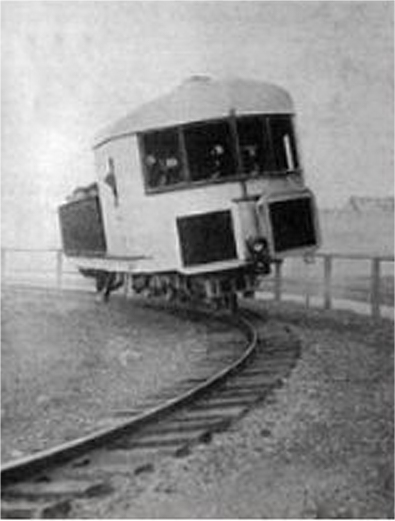 The Brennan Gyro-Monorail was developed by the Irish-born Australian inventor Louis Brennan. (1852-1932) It was 40 feet long and weighed 22 tons, and was designed to carry 10 tons. Speed on the level was 22 mph.