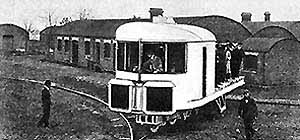 | Left: The Louis Brennan gyroscopic monorail, demonstrated to the press at Gillingham. Kent, on 10th November, 1909. Note the soldiers standing on the rear platform- apparently 40 of them.