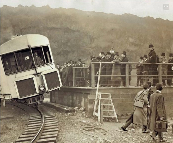 | Left: Trial run with gentlemen of the press scurrying out of the way: 1920?