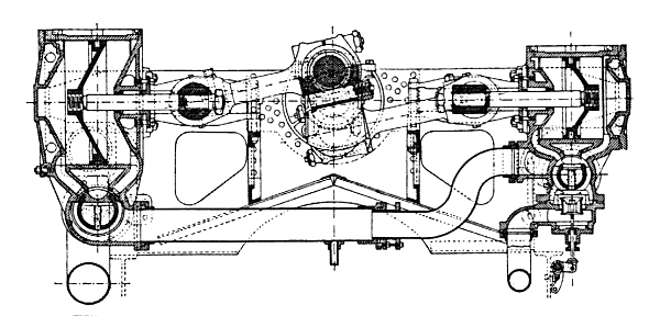 "The field winding is an insulated copper strip and the armature is a toothed drum wound in series and mounted on a hollow steel shaft which carries at one end a disk. This disk transfers the motion to the axle by means of three powerful links which are carried upon three corresponding pairs of springs secured between the arms of one wheel. The arrangement is shown in Figs. 3 and 5 in the accompanying illustrations. The axle passes with sufficient clearance through the hollow shaft,and the springs have sufficient flexibility, even under the full power of the motor, to allow free movement of the hollow shaft. The motors are all connected in parallel and each motor is fed by a special circuit from the switchboard and has its own switch and automatic cutout. For low speed and under heavy loads the motors may be grouped in a series of four by means of a controller. There is an eight-way switch for reversing the current in the armatures of the motors and for instantaneously changing their direction. The speed may be varied by means of a rheostat placed in the exciting circuit of the generators.