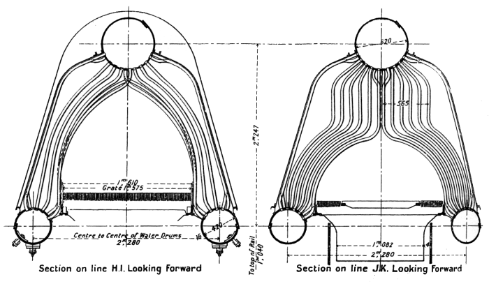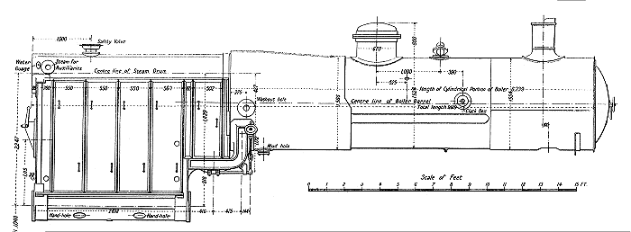 A second, modified boiler was ordered from the Creusot works in 1908. This version built on the lessons of the first; it had no firebricks and a vertical array of water-tubes protected the rear tube plate of the boiler from direct flame. (See section on line LM below) The firebox was joined much more rigidly to the boiler barrel. The heating surface was about 1000 sq ft, with a great area of 37 sq ft; figures that were thought to be unprecedented. At the time of the Engineer article, the engine had run over 20,000 miles in normal service, and it was said: "... so far no wear can be observed on any of the water tubes, while there is no perceptible amount of sediment deposited in any part of the boiler..."