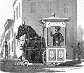"The design is to make a machine resembling a horse in form, so as not to frighten the horses on the streets. To this end the form shown is chosen. The motive power is steam, generated in a tubular boiler of from four to five horse power, located inside of the horse and forward of the cab. This drives a rotary engine of my own patenting, which is geared to the driving shaft of the machine. I also propose the use of gas as fuel, so as to do away with smoke. The steam is condensed in cold water carried in a tank of sufficient capacity on top of the cab. Gas is compressed in suitable tanks to a pressure of from 80 to 100 lbs. per square inch, and is used as fuel. The boiler is so constructed as to receive a supply of hot air to feed the flame the gases from which, after passing around the boiler. are conducted around the engine to prevent loss by condensation. The water is forced into the boiler from the condensed steam chamber. The engine is provided with a brake capable of stopping the apparatus within a space of twenty feet, while under a speed of eight miles per hour."