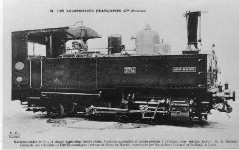 The locomotive is numbered No 3714. The text at the bottom of the postcard is barely legible, but indicates that the builders were Buffaud et Robatel of Lyon.