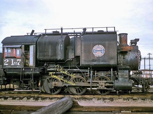 This 0-6-0 locomotive is included here because it looks well weird, guvnor. It is steam-shop switcher (shunting) loco No 217 on the Southern Pacific. It was rebuilt from a S-8 #1295. There is certainly full fenestration at the rear of the cab on the left, very suitable for cabforward operation. However, what really catches the eye are the two enormous saddle tanks over the boiler.