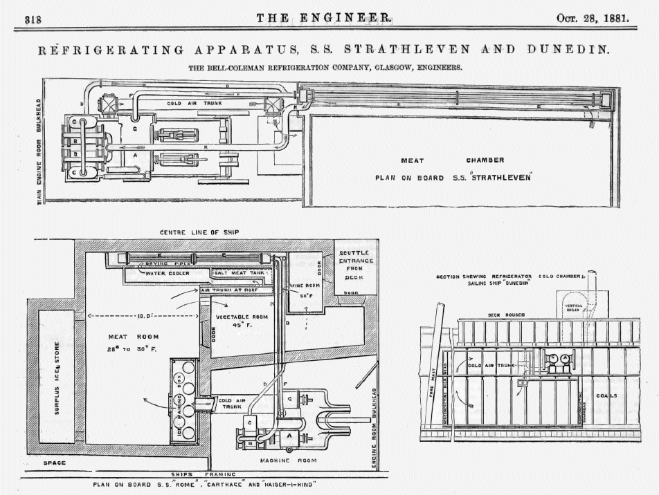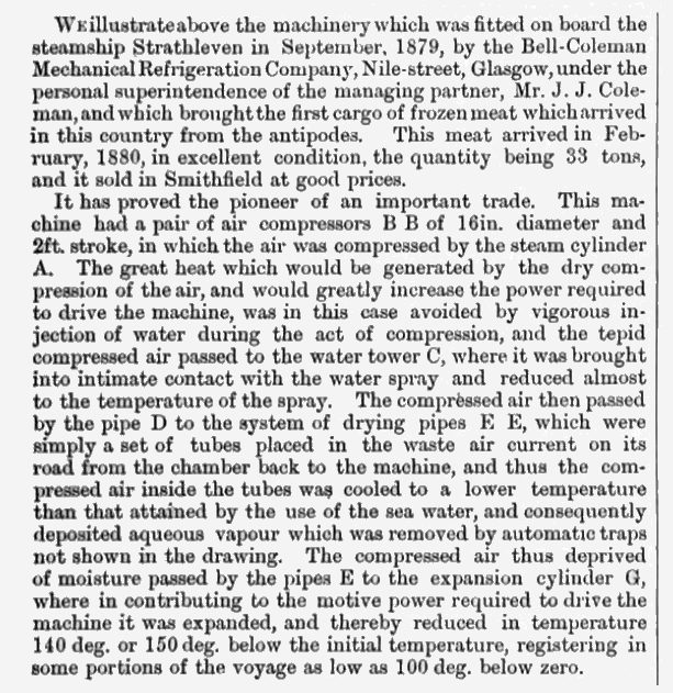 The first Bell-Coleman machine was used on the SS Strathleven, which brought the first successful cargo of frozen meat from Australia to London, arriving in February 1880. The machine illustrated above is described as "a new type of machine of small dimensions for the cooling of ships' provisions" rather than freezing the whole cargo.