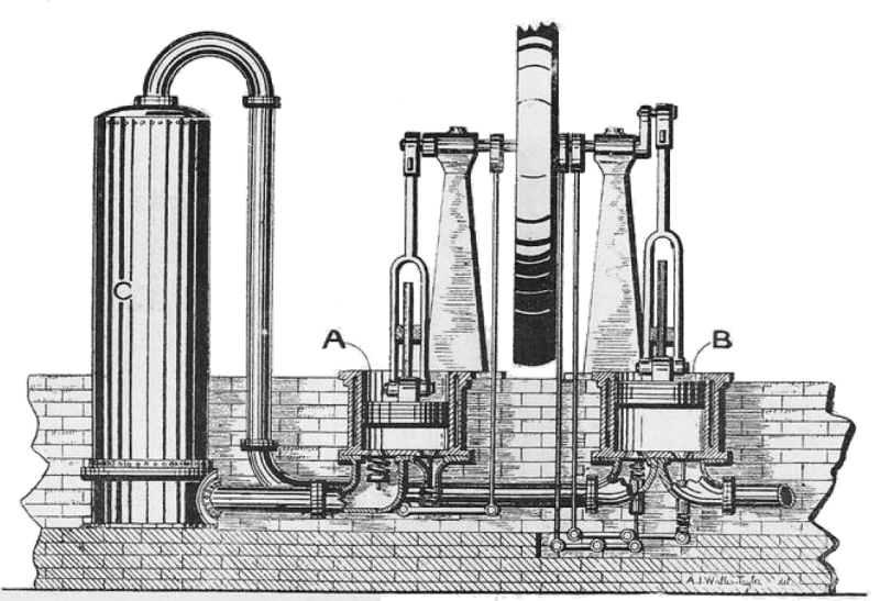 "Windhausen's machine expands air from its ordinary atmospheric pressure under a piston; the cooled and expanded air being discharged much below the atmospheric pressure, either through tubes surrounded externally by brine, or into a hermetically sealed chamber, where the objects to be frozen are placed. After this process the air is again compressed to atmospheric pressure, cooled, and re-expanded. The disadvantages of this machine are the large size of the cylinders, &c, necessitated by the very low pressure employed, and the fact of its entirely depending for its action on the production of a partial vacuum."