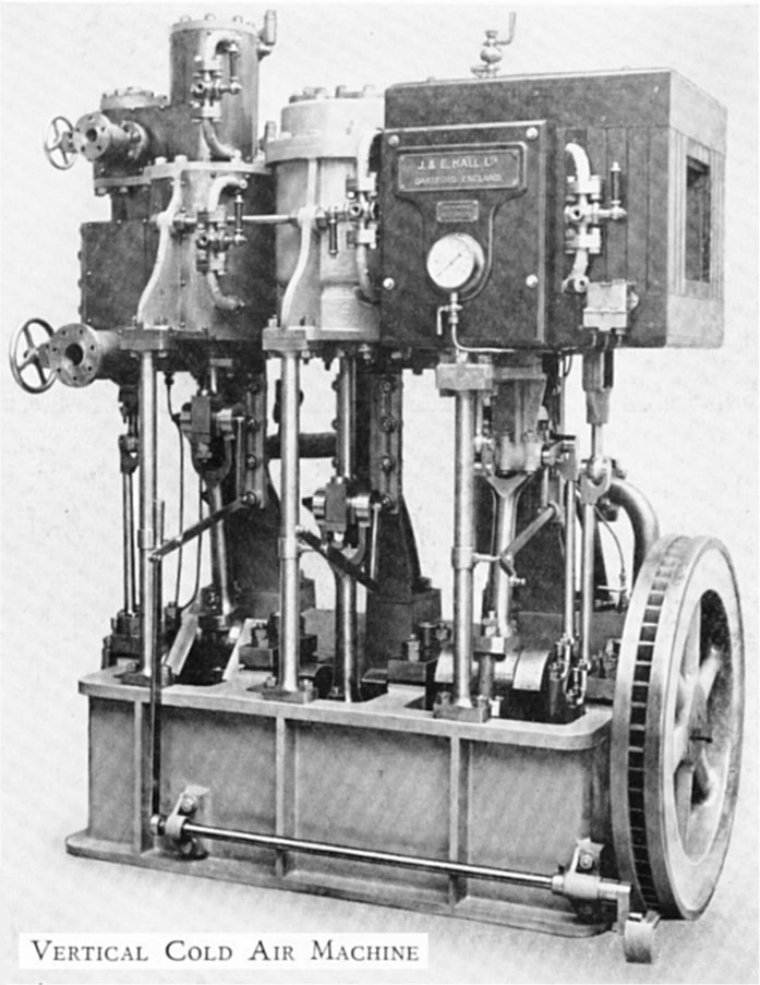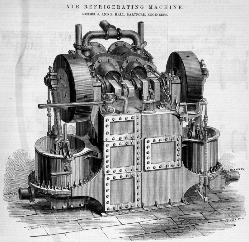 The passages quoted below are from an article in Engineering for 4th Feb 1881, which was a report on a long and comprehensive paper given by A Mr Lightfoot, an employee of Messrs J & E Hall and Co, of Dartford- who were at the time much engaged in the manufacture of cold air machinery to be used for the importation of frozen meat from Australia, a very important trade. J & E Hall of Dartford was founded in 1785.
