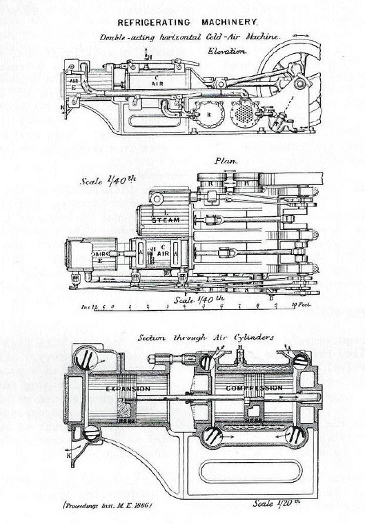 "The Bell-Coleman refrigerator consists of an ordinary machine for producing cold air by compression, cooling, and expansion, combined with an apparatus for depositing a portion of the moisture before the air is admitted to the expansion cylinder.