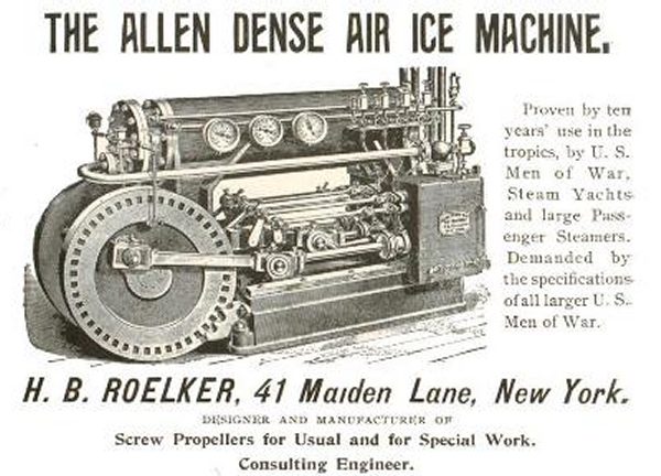 The splendidly-named Allen Dense Air Machine was a relatively late entry into the air refigeration market. Little is known about its operating parameter; I can only assume that 'Dense Air' refers to working at higher air pressures than usual to make the machinery more compact.