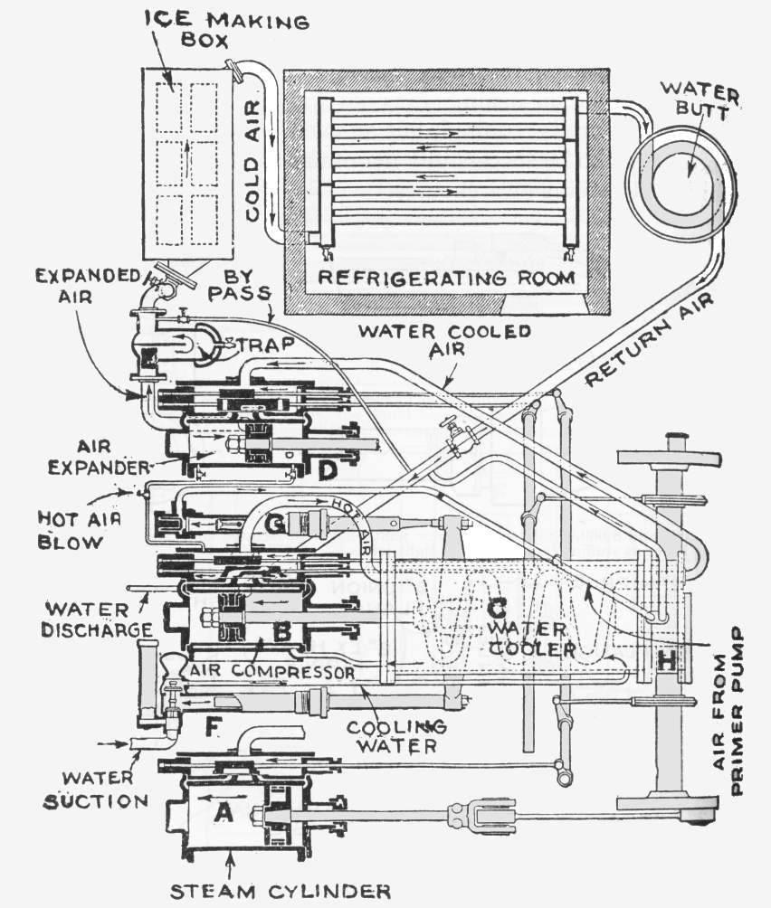 "Sturgeon's refrigerator is a horizontal machine with some novel arrangements as regards the construction of its air-valves and pistons. The compressed air is first cooled partially by being passed through tubes sunounded by cooling water, an then passed through charcoal or some other absorbent of moisture, before being admitted to the expansion cylinder. If the charcoal or other material is properly changed and renewed when necessary, this may form a dry air process; but, as already stated, the introduction of a chemical drier is in the author's opinion undesirable, except under special conditions."