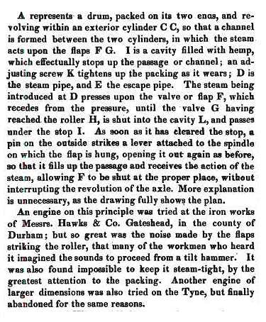 He said: "The grand points of difficulty are the mutation of action, the valve and the mode of backing when required. Should any of your readers be inclined to follow up the invention, possibly it may in the end produce a more ready application of steam-power than has hitherto been adopted."