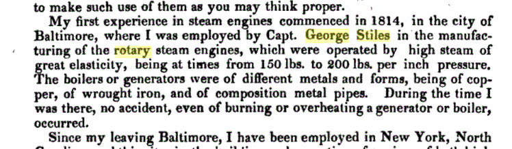 This is testimony in the Reports of Committees, Washington, 7 Dec 1831, in a 'General Report on the Explosions of Steam-boilers', by Ebenezer A Lester (of Boston, Mass) who is known to have patented a steam boiler on 14 May 1827. Other sources say he patented a 'Pendulum Steam Engine' on the same date. It appears Lester met Stiles in 1814, who was then a manufacturer at Baltimore, Maryland.