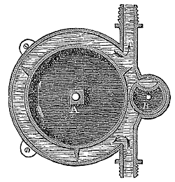 According to Bourne, it worked thus: the ends of the rotor NN are not concentric with the casing, but jam against the shoes when it rotates in the direction of the arrows. The springs p carry the shoes round with the rotor.
