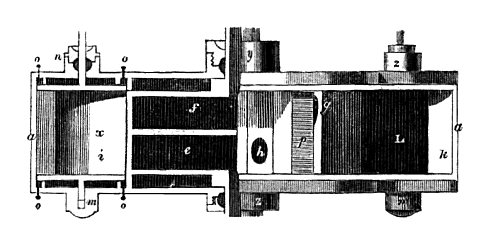 The engine used two rotating rectangular vanes A,B which were fixed to coaxial shafts, and rotated semi-independently. There are two steam valves a, and two exhaust valves b, in the surfaces of the vanes. In Fig 6 above, h is the steam inlet and k the exhaust.