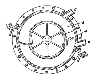 Steam entered and left via the rectangular ports in the side of the cylinder, labelled 6, 7, 13 and 14. The sliders would need to move pretty nippily to get out of the way of the rotating piston C, so there would be some quite large accelerations of reciprocating components. This runs rather counter to the basic philosophy of the rotary engine. The sliding-door principle was used in the Turner engine above.