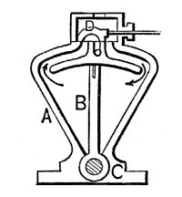 The transverse cylinder was fitted with "vibrating vane pistons" which oscillated the central shaft. There appears to be conventional Stephenson valvegear just to the left of the central shaft. (arrowed)