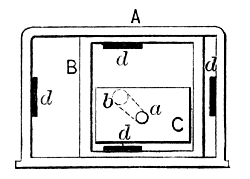 "The oblong square box,A, is the cylinder proper. b is a frame sliding freely in a horizontal direction by the force of the steam from the side ports, d,d. C is the inner rectangular piston, connected directly to the crank pin a, the shaft b, being central to the range of the moving pistons. The piston C receives steam from the top and bottom ports, d,d, within the frame B."