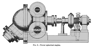 "At 500 rpm, a Tower motor with a 10 cm sphere can produce one brake-horsepower with steam at 3 atmospheres (44 psi) and 2.5 brake-horsepower if the pressure reaches 8.5 atmospheres (125 psi). A 20 cm motor produces 7 brake-horsepower at 3 atmospheres, 10 brake-horsepower at 4 atmospheres, 15 brake-horsepower at 6.5 atmospheres and 20 brake-horsepower at 8.5 atmospheres. The biggest model, of 65 cm diameter, produces between 234 and 624 brake-horsepower, depending on the steam pressure. Unfortunately we have no figures on the steam consumption corresponding to these different pressures. It is to be feared that it is much greater than motors with conventional cylinders and pistons."
