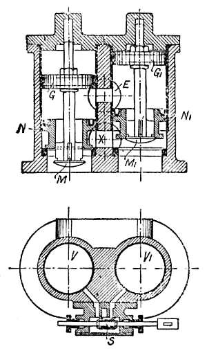 E is the inlet for power water and X the outlet. V and V1 are two auxiliary cylinders holding the valve pistons G and G1; their movement is controlled by the pilot slide valve S. Sliding on the spindles of these pistons are two annular valves N and N1 which control the exhaust. The inlet is controlled by the mushroom-headed valves M,M1.