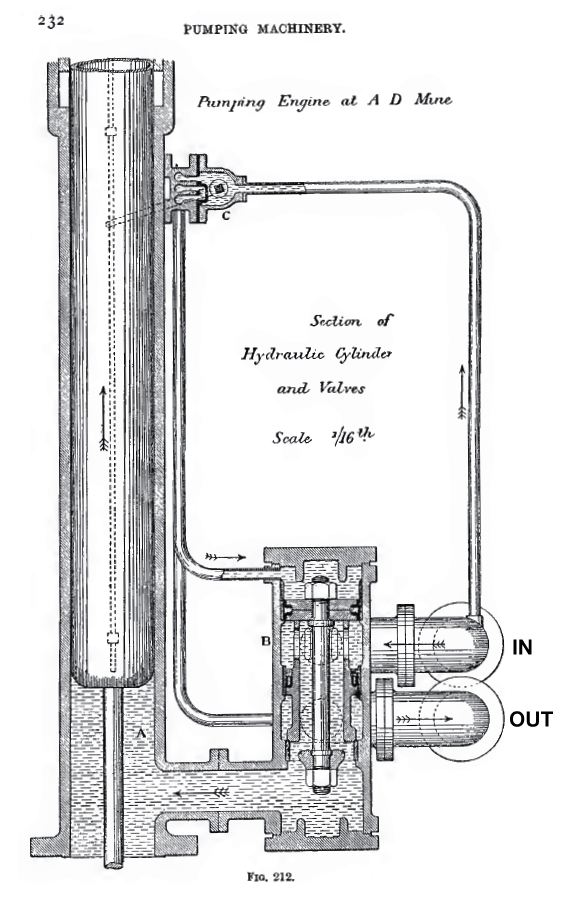So what happens to the exhaust water from the engine side? There is not much point in pumping water out of a mine if you're simultaneously filling it up with the exhaust water. The answer is that the exhaust was fed into the pump delivery, and returned to the surface. This obviously means that the exhaust water was still at considerable pressure. A 60 foot lift represents about 26 psi, so there was still plenty of pressure differential to work the engine side. The efficiency was claimed to be between 70 and 80%.