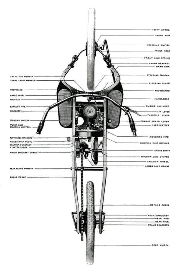 FF means Foot-Forward, and refers to a kind of motorcycle where the rider sits with feet ahead in a car-type sitting position, rather than with feet below and astride, as on normal motorcycles. The NeraCar (no, not my pun) was an FF motorcycle made in the USA from 1921 - 1926. Mr Lawson had therefore converted a machine that was already more than 20 years old.