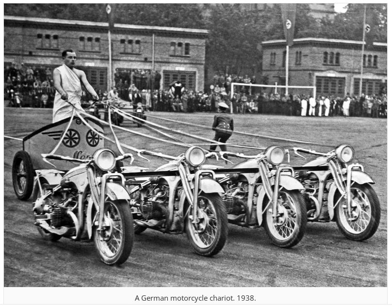 There appear to be two exhaust pipes leading to a cylindrical silencer under the headlight, and on top there are two tall pillars that appear to have springs around them; they are probably automatic inlet valves. This suggested a two-cylinder in-line engine, and it is now confirmed that it was a 1290 cc twin in-line unit.