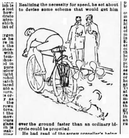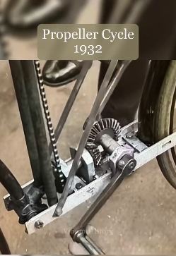 It is explained on the propellor-driven car page that a propellor is very inefficient at low speeds. This did not (if they knew it) deter the constructors of propellor-driven motorcycles. The impracticability is even greater in a machine where the only power source is human effort, and this probably explains why propellor-driven bicycles are rather rare compared with propellor-driven motorcycles.