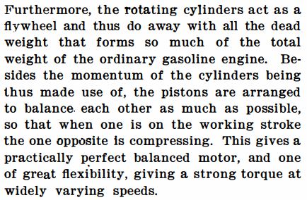 Here the main (and possibly only) advantage of the rotary engine is explained; since the whole engine rotates there is no need for a heavy flywheel.