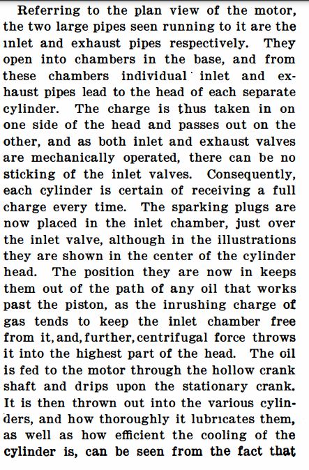 Here we learn that the inlet and exhuast valves were both mechanically operated, as opposed to having an 'automatic' inlet valve controlled simply by a spring, which opened on the induction stroke when the cylinder pressure fell below that of the atmosphere. Such inlet valves were simple but gave poor cylinder filling; the spring had to be weak to allow adequate induction, but was then liable to sticking open, bringing the engine rapidly to a stop. This is noted in this part of the article.