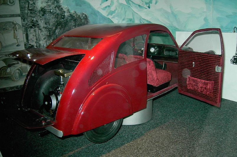 The Porsche 12 was intended as an 'everyman' car (like the Volkswagen was supposed to be) and was designed by Ferdinand Porsche for the Zundapp company. Only three prototypes were built, and all were lost during WW2. The Citroen 2CV, introduced in 1948, was a similar project, but went on to be very successful. The 2CV had a flat-twin engine driving the front wheels. I once had one.