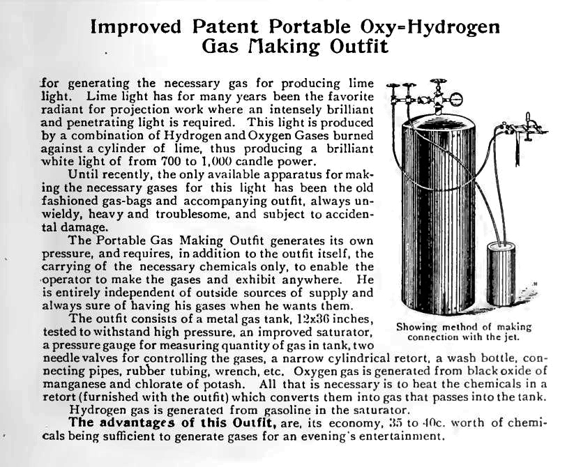 ![]() | Left: A Word on how to supply the gases to the limelight: 1880s