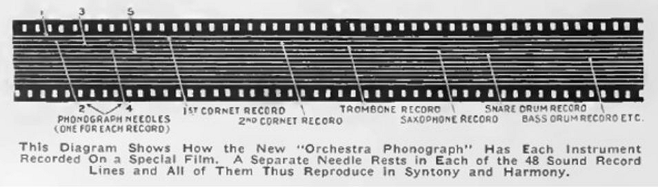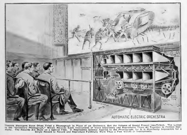 One problem with adding sound to silent films was that even if you could maintain sync between the film and the phonograph, the volume of the latter was completely unable to fill a theatre. The Automatic Electric Orchestra Phonograph solved this by having no less than 48 phonographs working in parallel. Each had a horn and a tone-arm that reproduced sound from a separate track cut into a strip of film. The film was moved by an electric motor.
