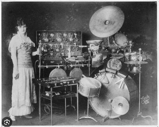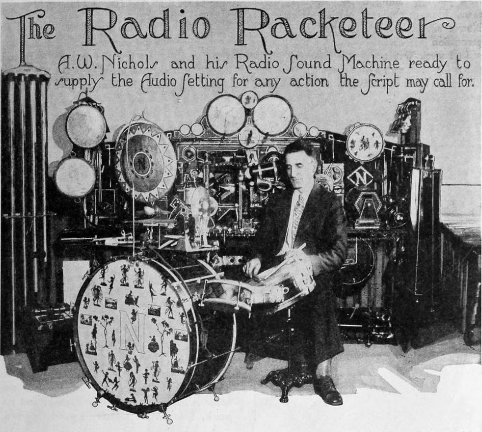 A promotional card for radio sound effects practitioner A W Nichols. He sits at a conventional drum kit while behind him is a vast cabinet apparently holding a large number of sound machines. He was married to another sound practitioner Ora Nichols.